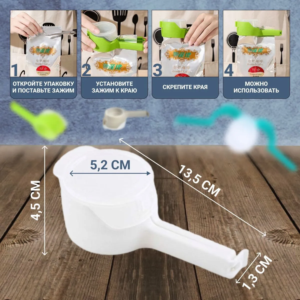 Користуватися їй дуже просто: Надягніть кліпсу на відкритий пакет; Клацніть її; Для насипання продукту відкрийте кришку кліпси.